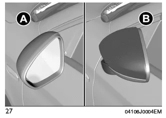 Bei Bedarf (z.B. wenn die Abmessungen des Spiegels bei engen Durchfahrten Schwierigkeiten bereiten), können die Spiegel umgeklappt werden, indem sie von der Stellung (A) auf die Stellung (B) Abb. 27 verstellt werden.